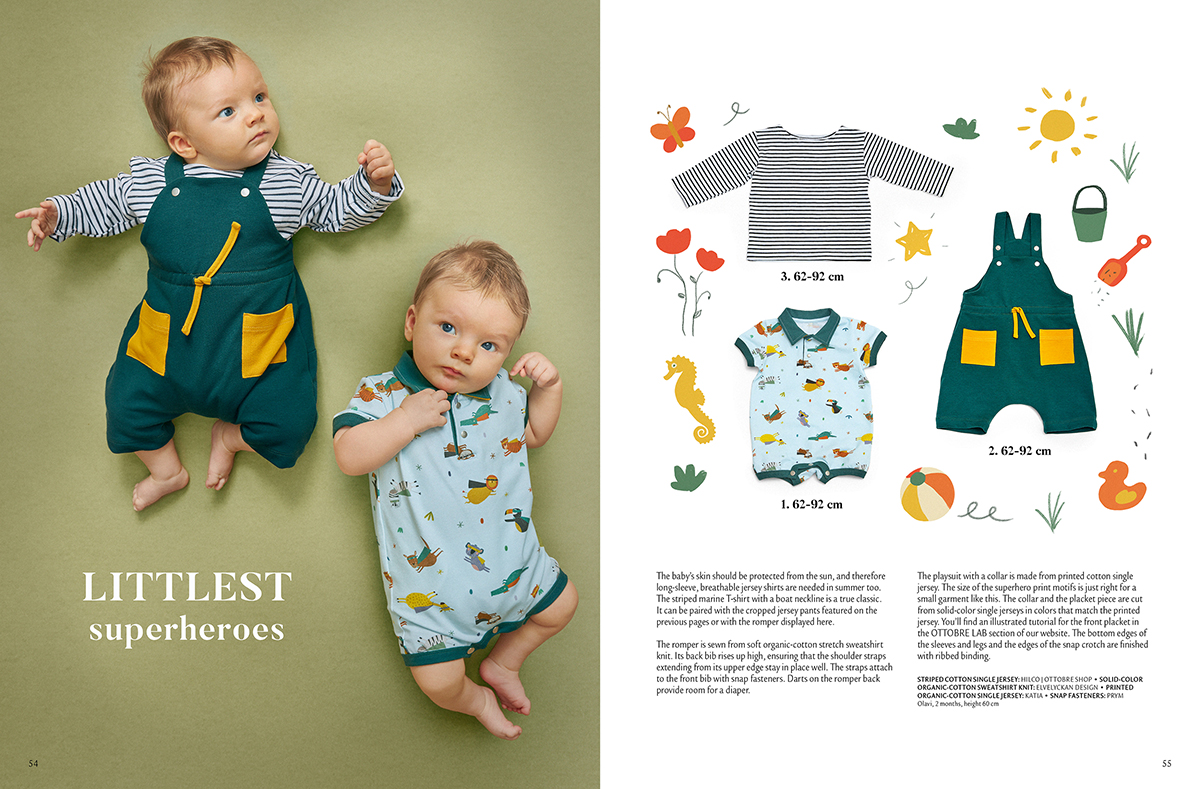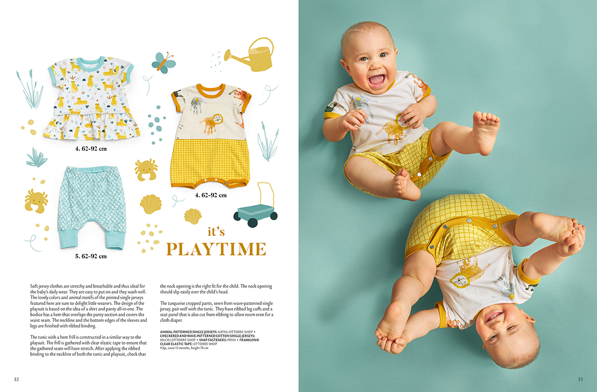 Oblíbené „romperky“ jsou ušité z potištěného bavlněného jednolíce, lemy a límeček jsou z kontrastního jednobarevného úpletu. Velikosti všech modelů: 62-92.
