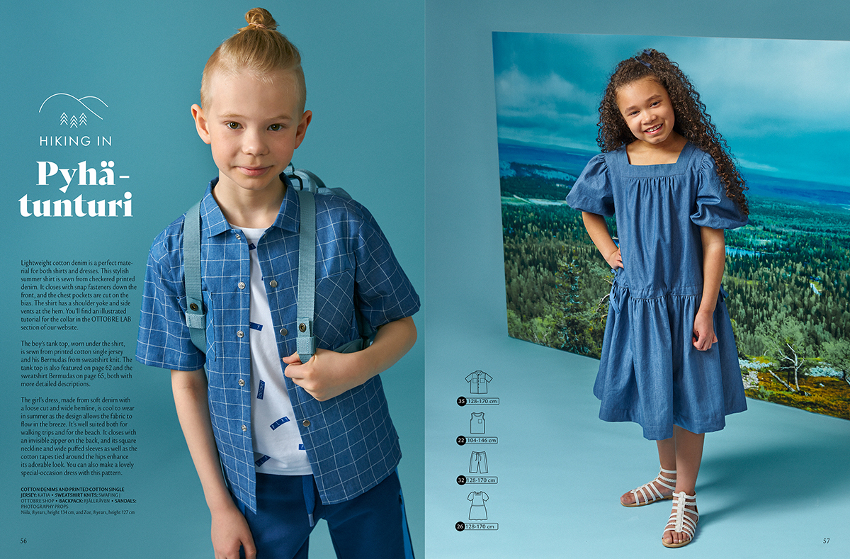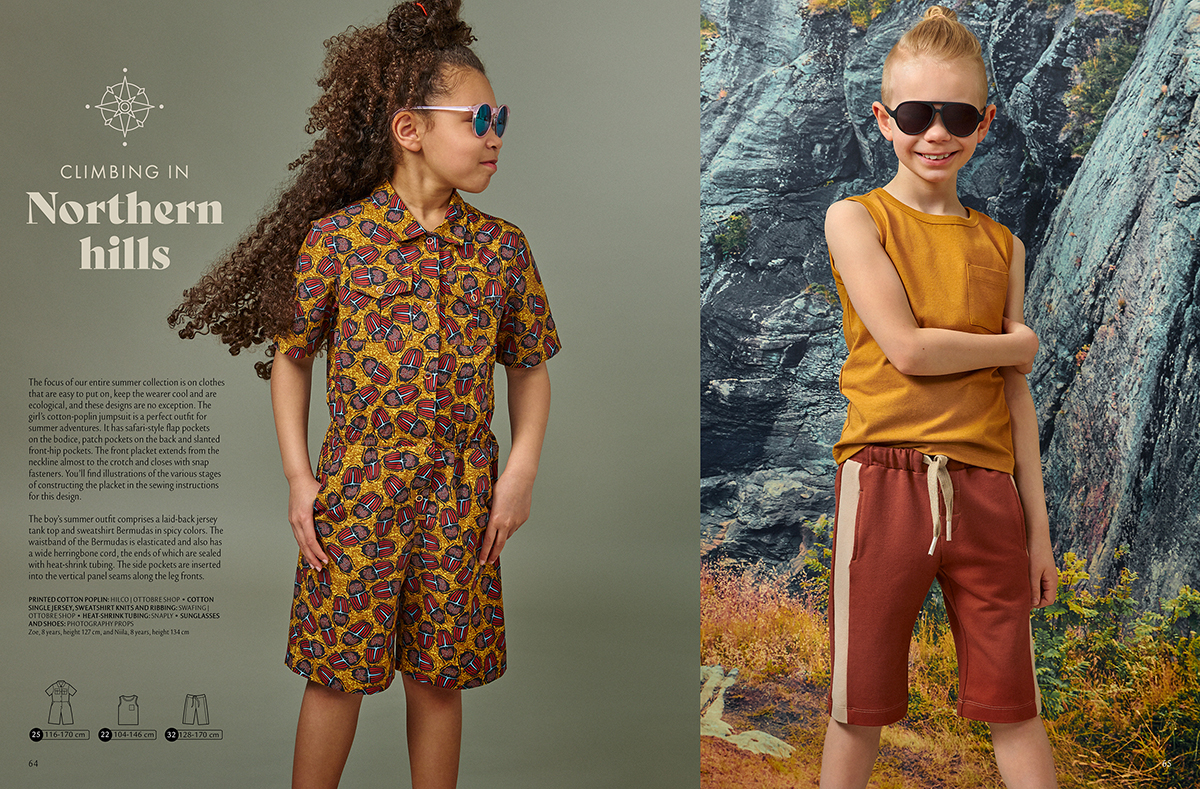 Košili z následující strany už známe, tato je ušitá z lehkého letního denimu. Doplňuje ji nátělník z bavlněného jednolíce a bermudy z teplákoviny, se kterými se podrobněji setkáme ještě o pár stránek dál. Nátělník je ve velikostech 104-146, košile a kalhoty 128-170.