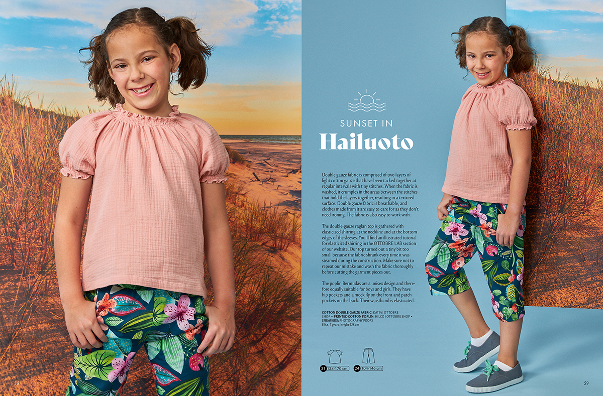 Ani tato halenku není úplně nová, jedná se o větší variantu střihu na „ovesnou“ halenku se zlatým potiskem, která je na str. 7 a také na titulce. I tato je ušitá z pohodlného mušelínu (dvojité gázoviny, fáčoviny). Bermudy už se také představily na str. 17 v zeleném provedení. Tyto jsou ušity z bavlněného popelínu.