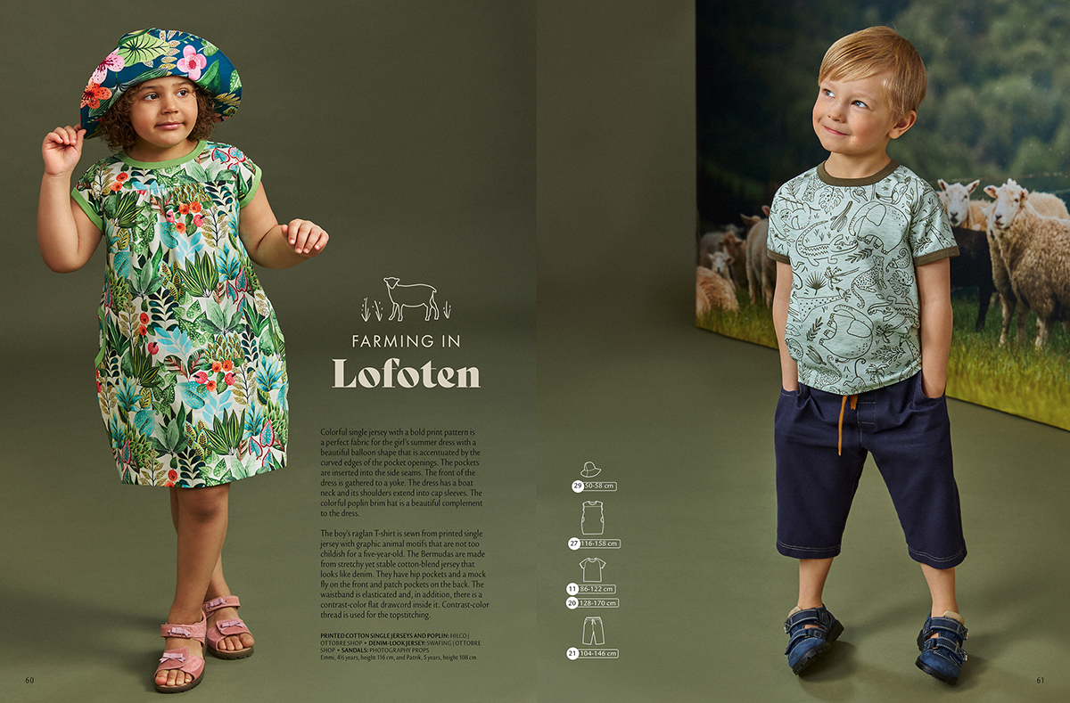 Bermudy jsou tentokrát ušity z úpletu imitujícího džínovinu, takže budou extrémně pohodlné. Velikosti: 104-146. Triko s raglánovým rukávem se rovněž objevuje opakovaně.