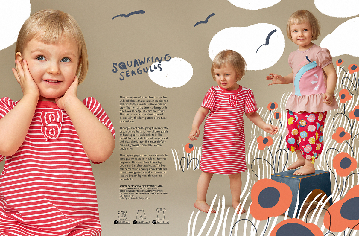 Halenka z mušelínu se zlatým potiskem je rychlá na ušití. Pokud s řasením elastickou nití nemáte zkušenost, opět můžete využít tutoriál na stránkách Ottobre LAB (druhý obrázek zleva v první řadě, dámská halenka se srdíčky), ale bohužel se asi neobejdete bez znalosti angličtiny. Nicméně návodů na řasení pomocí gumičky je na internetu spousta, stačí zadat téma do vyhledávače a najdete obrázkové či videonávody i v češtině. Halenku doplňují pohodlné kalhoty „culottes“, které frčí v dámské módě už pár sezón a zjevně hned tak nezmizí. Kalhoty jsou ušité ze lnu, mají na bocích kapsy a jsou všité do pásku s gumou, takže i malé holčičky zvládnou oblékání s minimální asistencí. Mimochodem, halenka i kalhoty jsou v barvě „ovesné vločky“, což je údajně trend tohoto léta. No, upřímně, ani jsem netušila, že existuje barva s tímto názvem, a to si tedy dost potrpím na rozlišování odstínů broskové, meruňkové, korálové, humrové, lososové… ale tady bych prostě nudně zůstala u béžové. Člověk se pořád dozvídá něco nového