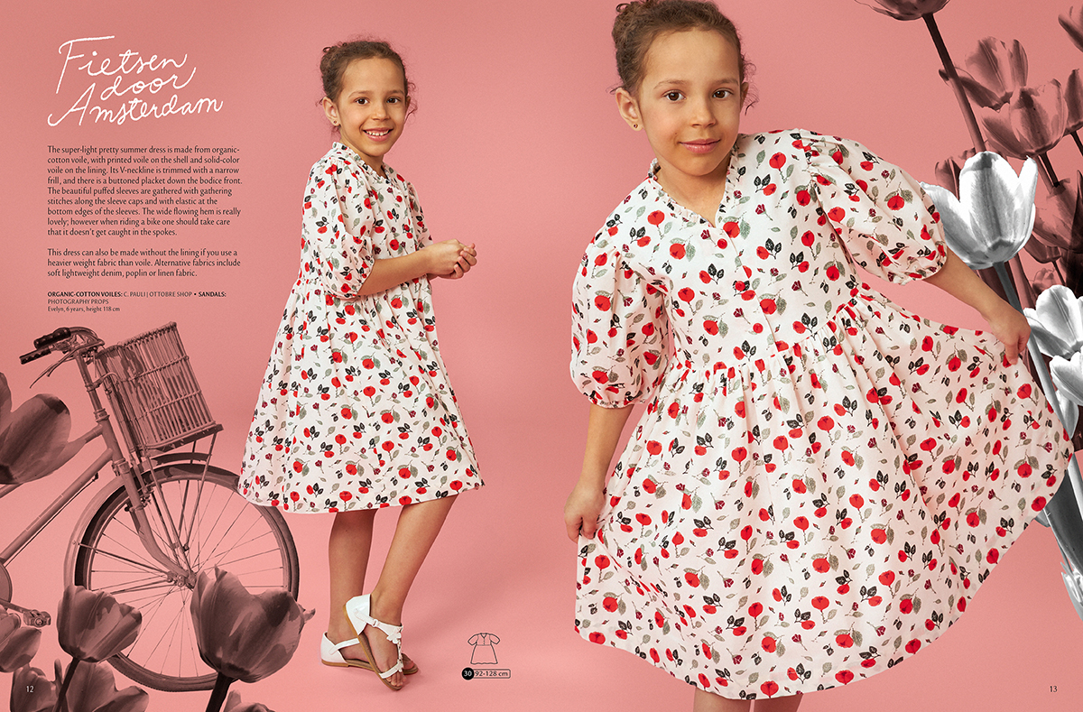 Letní šaty pro trochu větší holčičky (velikosti 92-128) jsou ušity z voálu z organické bavlny. Vrchní část šatů je z voálu potištěného, podšívka z jednobarevného. Výstřih do véčka má namísto límečku či oblíbeného stojáčku atraktivní řasený proužek. Horní část šatů je propínací. Široké rukávy jsou zřasené v rukávové hlavici i na spodním okraji. Pokud budete šít z méně průhledných materiálů, např. popelínu, lehké džínoviny, lnu apod., tak samozřejmě podšívku vynecháte.