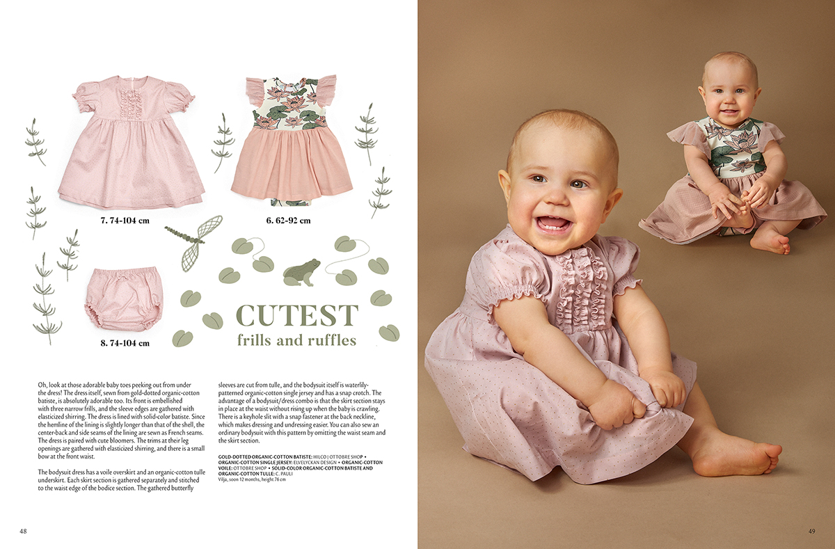 Další modely jsou pro nejmenší děti. Tlumená pudrově růžová nevychází z módy a na malých holčičkách bude vypadat obzvlášť stylově. Šatičky z lehkého batistu s jemnými zlatými tečkami klasického střihu jsou ozdobené třemi řadami malých rýšků. Dalším zdobným detailem je nabíraný balonkový rukáv. Šaty jsou podšité jednobarevným batistem. Opět platí to, co u předchozích modelů – podšívku lze vynechat, záleží na tom, jakou látku použijete. Tady ale tvoří podšívka další zajímavý detail, protože je o něco delší, než sukňový díl šatiček. Střih se dá využít na ušití skutečně slavnostního modelu, představte si horní vrstvu třeba z bavlněného tylu nebo krajkoviny a originální šaty na svatbu nebo nějakou hodně výjimečnou příležitost jsou na světě. Místo rýšků můžete střih obměnit třeba širokou saténovou stuhou v pase. Šaty doplňují nabírané kalhotky, pro které už se i u nás vžil anglický název „bloomers“. Dávají dost prostoru pro plenku, jsou pohodlné, vhodné do horkých dnů a přitom decentně kryjí, co mají. Velikosti: 74-104.