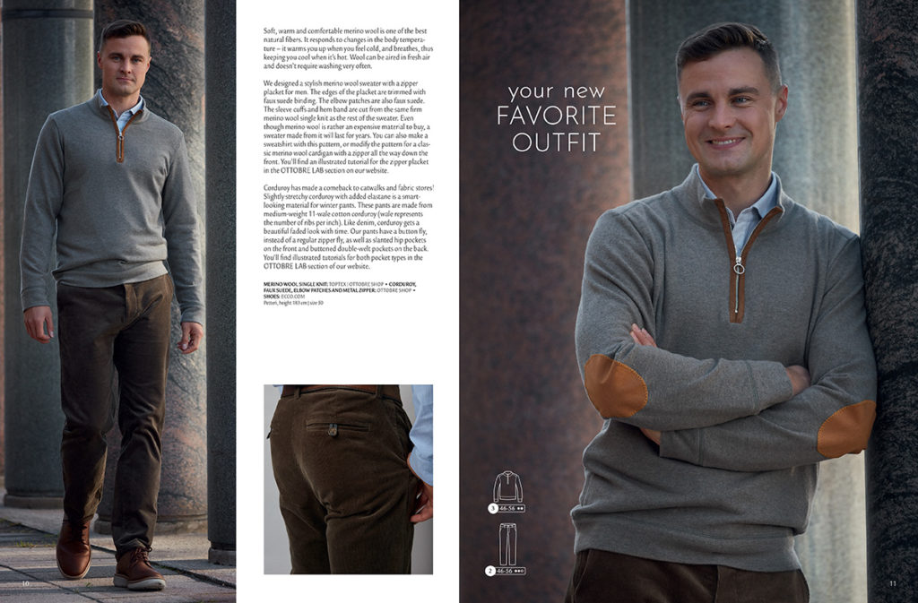 Na další dvojstraně se opakují kalhoty z předchozí stránky, tentokrát doplněné fantastickým svetrem. Ještě před pár lety bychom nad takovou fotografií marně slintaly, protože bychom svetr neměly z čeho ušít. Aktuální nabídka svetrovin nebo úpletů různých typů však nabízí nekonečné možnosti a střih můžeme (třeba s drobnými variacemi) využít opakovaně.