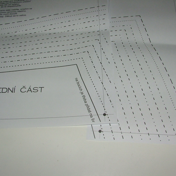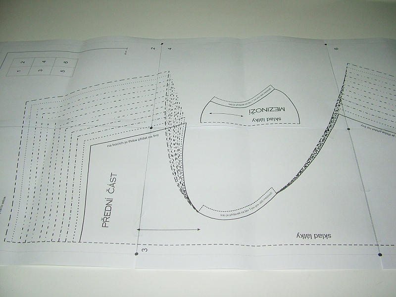 Nejdřív něco o samotné střihové předloze. K dispozici je vytištěný střih ve formátu A1 nebo si můžete koupit přímo u Caramilly střih v .pdf, který si buď ve formátu A4 můžete vytisknout doma na tiskárně a slepit nebo ve větším formátu nechat vytisknout v copyshopu. Jak už jsem psala v článku o cardiganu Nikki, doporučuju ověřit si ceny tisků, můžou se velmi výrazně lišit. Pokud bych měla dát stovku za velký arch, tak to si asi radši pohraju s lepením střihových dílů doma, ale u nás ve Zlíně se ale dá formát A0 pořídit za 40 korun a A1 za polovinu, tak v takovém případě pro mne platí, že čas jsou peníze a střih si radši nechám vytisknout. Nicméně konkrétně tento střih se skládá pouze z šesti listů, to člověk slepí raz dva.