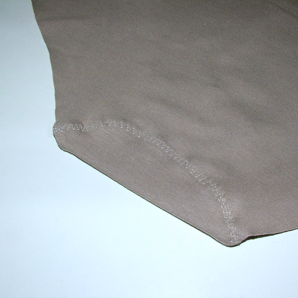 Pro šití varianty bez lemů, která mne velmi zajímala, Caramila doporučuje bambusový úplet ze sijemdetem, jehož okraje se nerolují, nebo také prémiový funkční úplet z unuodesign.cz. Já jsem volila bambusovou variantu. V době nákupu materiálu bohužel nebylo moc barev na výběr, takže jsem vzala klasicky černou a pod světlé oblečení jsem chtěla nějakou tělovou variantu. K dispozici byla pouze holubičí šeď, tak jsem vzala tu. Omlouvám se za upřímnost, ale musím říct, že je to opravdu extrémně hnusná barva;-) Ani tělová barva není obecně nějak zvlášť atraktivní, ale tento konkrétní odstín šedobéžové mi evokuje opravdu velmi nepěkně zašlé a zaprané prádlo. Svou funkci sice plní, pod světlým oblečením vidět není, ale vždycky si vzpomenu, jak maminky a babičky říkávaly, že člověk nemá chodít v ošklivém prádle, protože nikdy neví, kdy ho srazí auto a dostane se třeba do nemocnice. Tak v těchto kalhotkách bych tedy opravdu sražená být nechtěla;-)