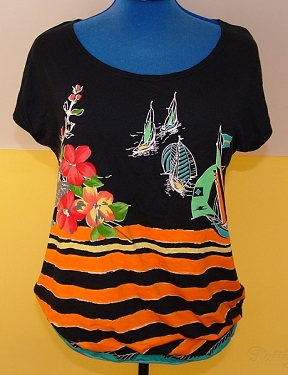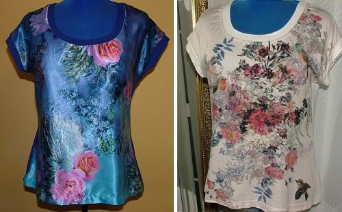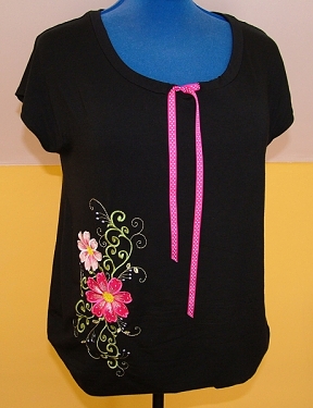 Já jsem jej použila na jednoduché triko z potištěné viskózy a triko z černé viskózy, na kterém jsem si chtěla vyzkoušet nově vytvořenou aplikaci. Stříhala jsem z obou látek najednou, což nebyl úplně dobrý nápad, protože po ušití prvního kusu se ukázalo, že rukávy jsou pro mne krátké a moc otevřené a výstřih široký. Vyšívané tričko jsem tedy následně mírně upravila, do výstřihu i průramků jsem všila lemy, výstřih jsem pak ještě stáhla šňůrkou.