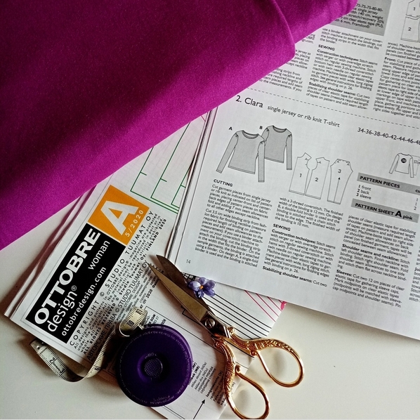 – nedokončené triko, které je spíš UFO z bezradnosti, než z neschopnosti dokončovat. Použila jsem .pdf střih od německé autorky jménem Prülla, triko je nastříhané a nahrubo sešité, ovšem naprosto tragicky nesedí a já nevím, co s tím, jak to zachránit. Takže čeká na hromádce na nějaké mé vnuknutí, jak ho opravit, abych to celé nemusela vyhodit nebo rozstříhat na kalhotky. Mimochodem, střih nebyl úplně levný, ač jsem ho asi kupovala za nižší cenu v nějaké akci, každopádně to, jak nesedí, mě hrozně zklamalo a zase mě to na chvíli odradilo od nákupu .pdf střihů nevyzkoušených tvůrců a vrátilo mě to k Ottobre, kde se mi prostě nestane, že by něco bylo tak moc mimo.