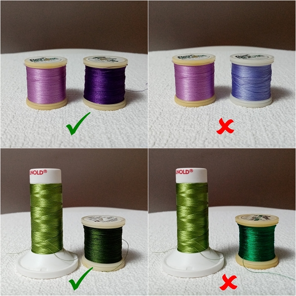 Nicméně stejně jako příroda nabízí mnoho barevných variant macešek, tak ani vy se nemusíte přísně držet rozpisu. Jen doporučuji si pokud možno změny předem připravit v nějakém editačním programu (Embird, PE-design), anebo aspoň před vyšíváním poskládat zvolené nitě vedle sebe, aby vám barvy ladily. Při stínování je to obzvláště důležité. Není fialová jako fialová, vždy je lepší ladit tóny stejné teploty. Studený odstín fialové s nádechem do modra nevypadá úplně přirozeně, když je použit ve stejném vzoru s teplejším tónem směřujícím více k červené. Schválně si zkuste, co působí pro oko harmoničtěji: