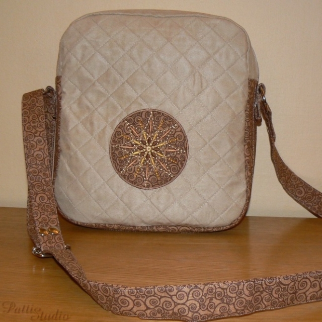 V rámci testování jsem vyrobila jednu mandalu i pro kamarádku na kabelku, kterou si šila. Látku si dodala, barvy byly voleny tak, aby ladily tón v tónu. Moc mě vždycky těší, když vidím uplatnění mých výšivek v praxi.
