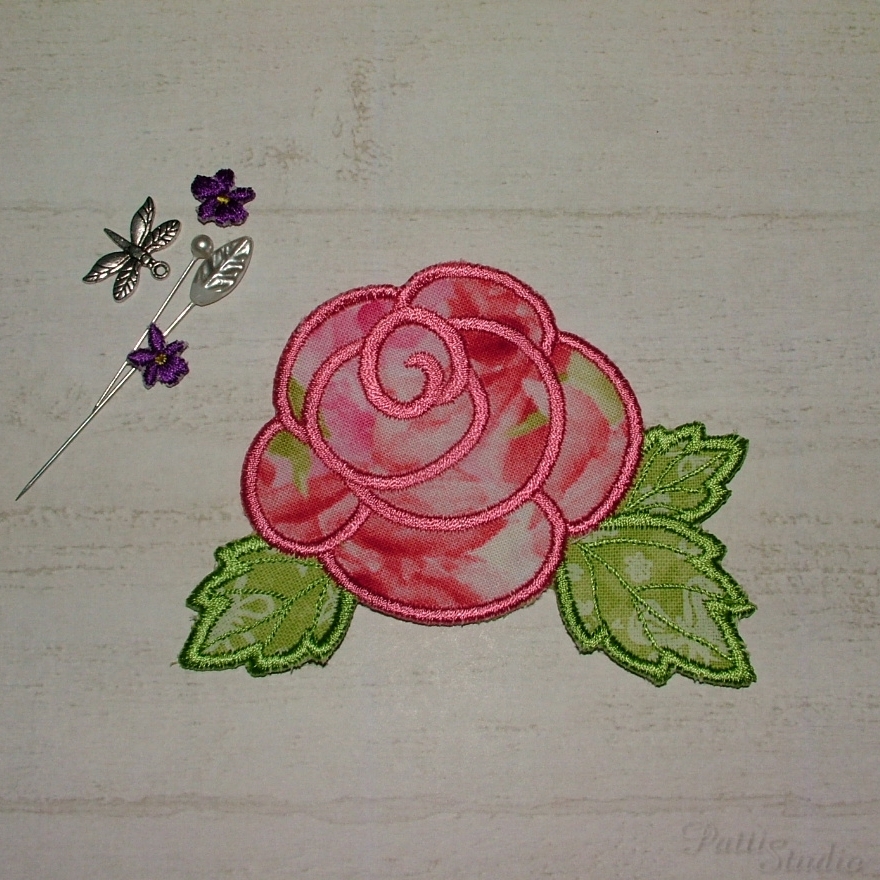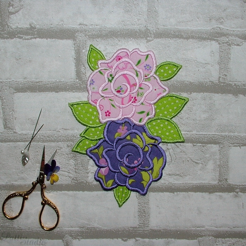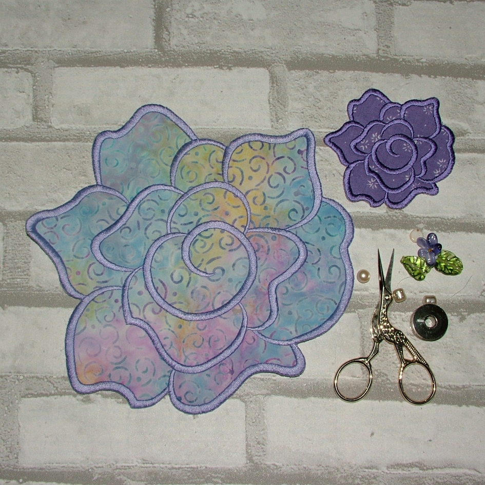 Zkoušet nové látky u osvědčených vzorů je někdy zábava, ale ještě větší zábava byla vyzkoušet osvědčený vzor ve větší velikosti. Z obrázku to možná není tak dobře poznat, ale ta velká růže vlevo je FAKT velká, 20×20 cm, viz spodní cívka na fotografii pro porovnání velikosti. Oproti ní je ta pravá růže v klasické velikosti kolem osmi centimetrů úplný prcek. Zatím ještě ani nevím, co s tak velkou aplikací podniknu, byl to jen takový nezávazný test a povedla se líp, než jsem čekala.